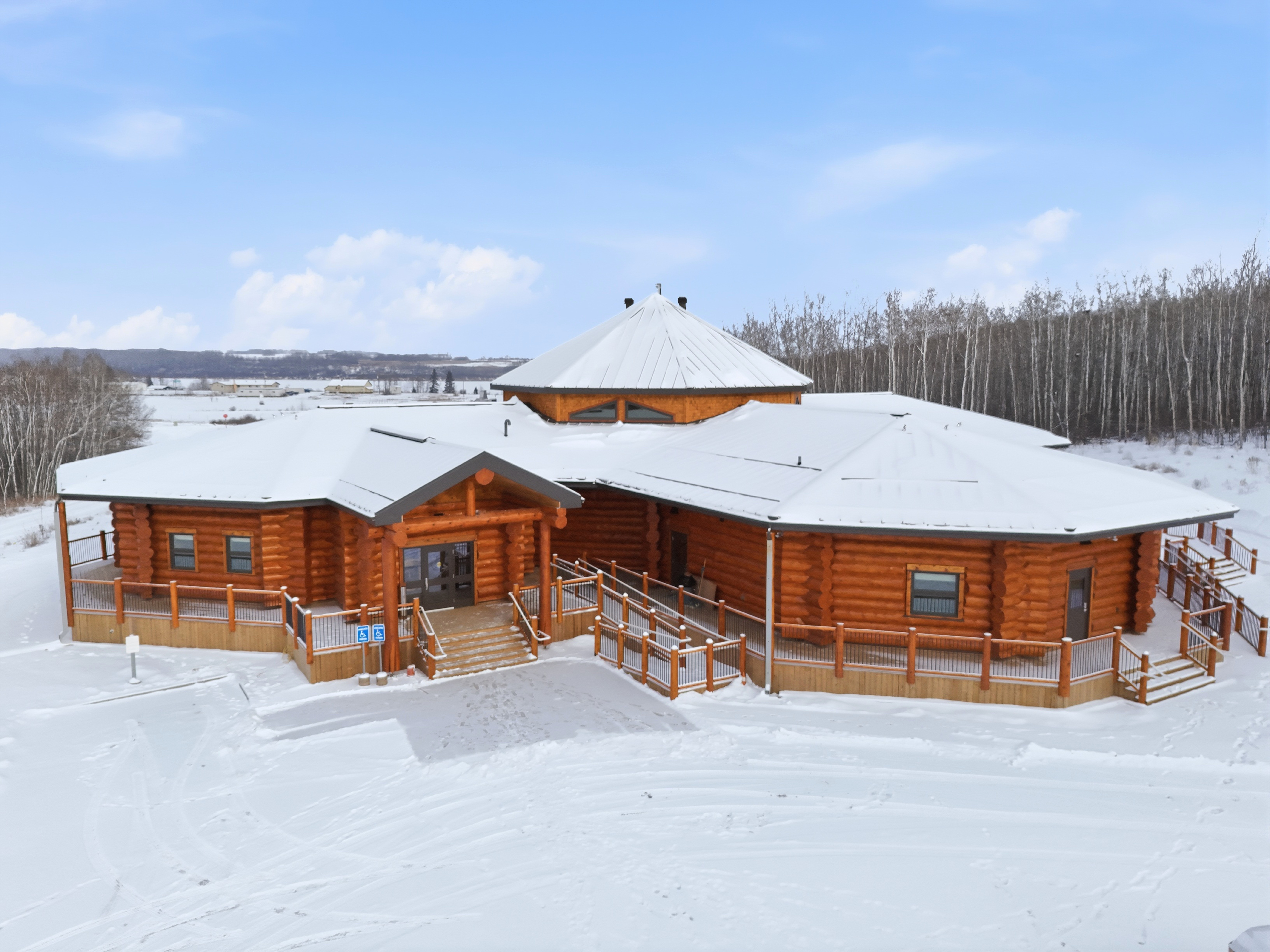 Lakeland’s scope of work included a 9,375 square foot handcrafted facility built from locally sourced white spruce logs, plus a surrounding deck, bringing natural materials and craftsmanship to the forefront.