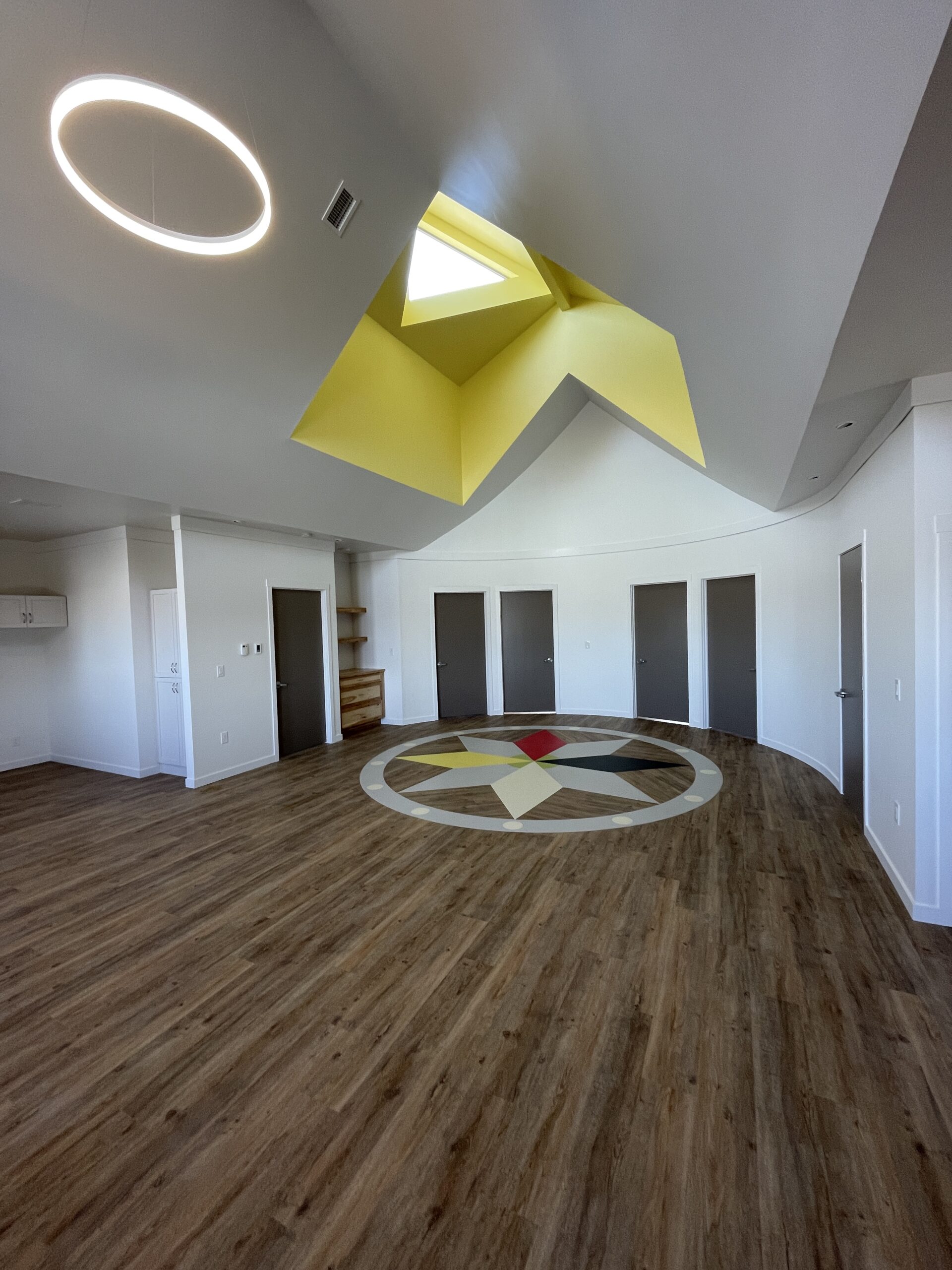 This specialized facility marks the first phase of a multi-phase project aimed at addressing the effects of multi-generational trauma through holistic family healing. The facility consists of four 1,860-square-foot dwelling units, handcrafted from locally sourced white spruce logs, with eastern-facing roof peaks designed to capture morning sunlight and custom cultural floor designs that honor community traditions.